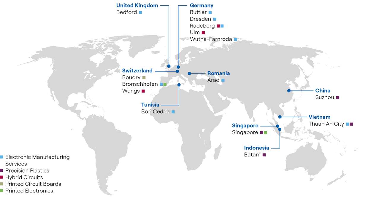 The Cicor Group is a globally active provider of full-cycle electronic solutions from research and development to manufacturing and supply chain management. Cicor and its approximately 2500 employees create value to its customers through the combination of customer-specific development solutions, high-tech components, as well as electronic device manufacturing. The Group, head-quartered in Bronschhofen (Switzerland), operates 15 production sites in Switzerland, the United Kingdom, Germany, Romania, Tunisia, Singapore, Indonesia, Vietnam and China.